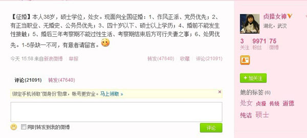 新华报业网讯 今天(3月20日),38岁贞操女神涂世友在新浪微博公开征婚,要求党员公务员处男优先,婚前不发生性行为,婚后三年考察期不过性生活。征婚微博引无数网友围观,“又一个凤姐来了。”网友感叹怎么会有男人经得起考验?贞操女神会成为剩斗士。