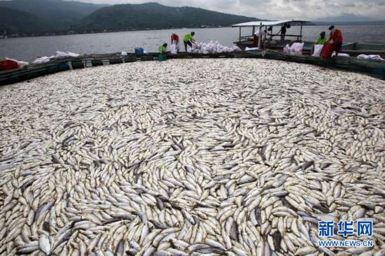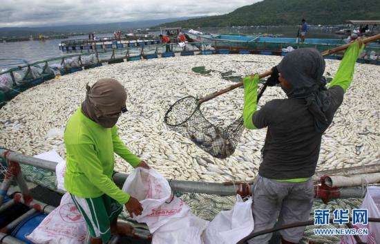 这张2011年5月29日拍摄的照片显示的是菲律宾吕宋岛西南端八打雁省的塔阿尔火山湖中打捞上来的死鱼。菲律宾政府29日说,塔阿尔火山近期显现喷发迹象,火山口周围的塔阿尔火山湖水温骤然升高,致使700多吨鱼类死亡。菲律宾渔业和水生资源部说,自27日以来,已发现752吨死亡的遮目鱼和罗非鱼漂浮在塔阿尔火山湖湖面。新华社/路透