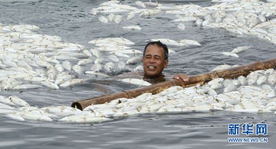 5月29日,一名渔民在菲律宾吕宋岛西南端八打雁省的塔阿尔火山湖中转移湖面上漂浮的死鱼。菲律宾政府29日说,塔阿尔火山近期显现喷发迹象,火山口周围的塔阿尔火山湖水温骤然升高,致使700多吨鱼类死亡。菲律宾渔业和水生资源部说,自27日以来,已发现752吨死亡的遮目鱼和罗非鱼漂浮在塔阿尔火山湖湖面。新华社/路透