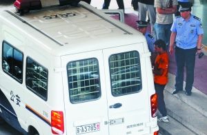 直至上午11时许,一辆带有铁护栏的警车停在宾馆外,大堂内走出一身着橘黄色T恤的年轻男子,衣服上沾有泥土。该男子上了带铁护栏的警车后被带走。