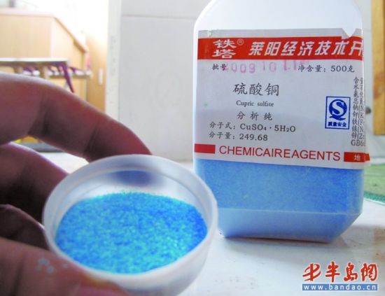 那些鲜亮粽子到底是怎么做出来的呢?记者上网查询了一下,结果发现这其中最主要的一味料便是“硫酸铜”。在嘉定路上一个专门销售化工原料的商铺内记者就找到了硫酸铜,这种产品的结晶水合物俗称明矾,主要是用作纺织品的媒染剂、农业杀虫剂、水的杀菌剂等。记者花费25元购得了一瓶500克的硫酸铜,准备用实验来揭秘鲜亮粽叶。