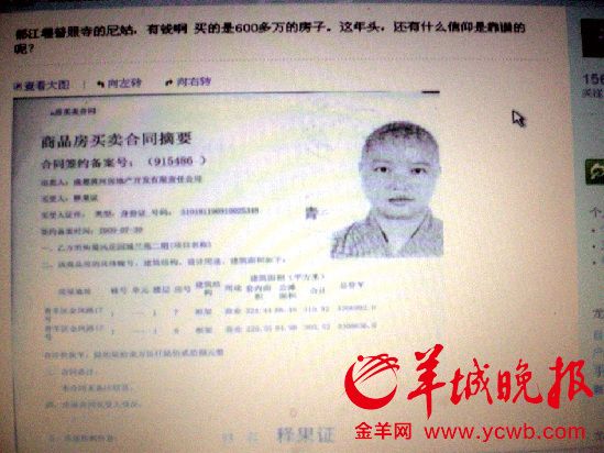 记者从新浪网上看到,发微博的网友叫“龙灿”,来自四川成都;而当事人叫“释果证”。在网上见到的《商品房买卖合同摘要》中见到:开发商是成都黄河房地产开发有限公司,买受人写的是:释果证,合同签约号为:915486。