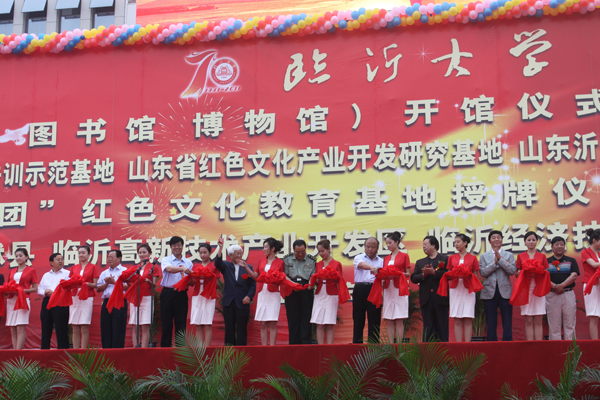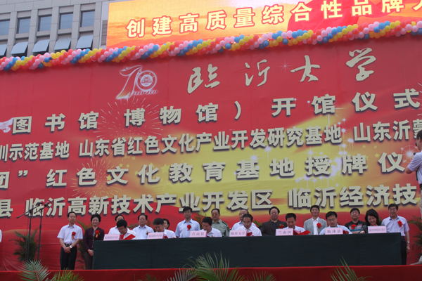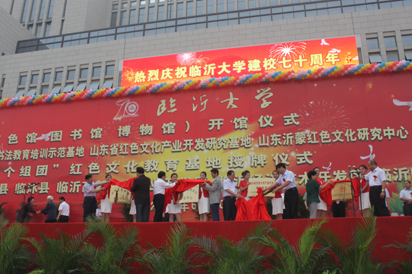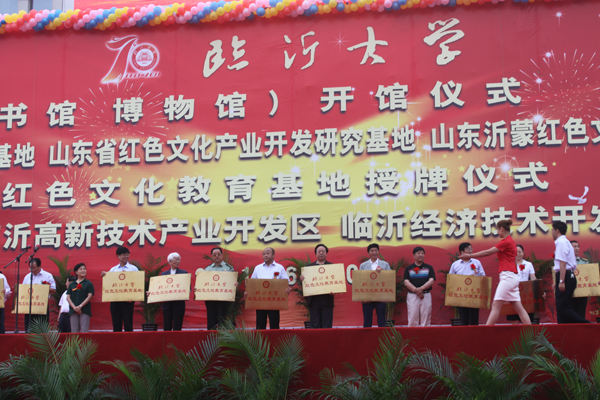 6月10日上午,临沂大学在新图书馆广场举行临沂大学“三馆”(红色馆、图书馆、博物馆)开馆仪式、“一个中心、八个组团”红色文化教育基地授牌仪式、“两基地两中心”(全国书法教育培训示范基地、山东省红色文化产业开发研究基地、山东沂蒙红色文化研究中心、山东羲之书法研究中心)揭牌仪式。