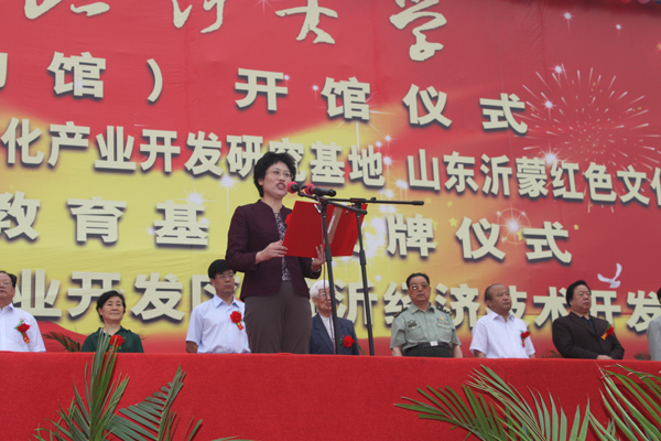 张少军、杨淑琴为全国书法教育培训示范基地揭牌;李乃胜、孟宪海为山东省红色文化产业开发研究基地揭牌;邢玉斗、申长友为山东沂蒙红色文化研究中心揭牌;张业发、朱绍阳为山东羲之书法研究中心揭牌。