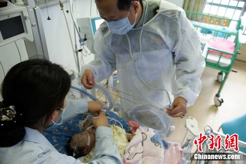 医护人员正在对双头女婴进行诊疗。中新网发 李春梅 摄。