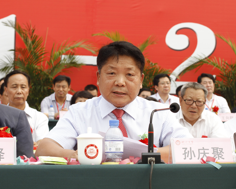 孙庆聚在致辞中说,临沂是著名的革命老区。在革命战争年代,中国共产党在沂蒙山区建立根据地近20年,百万沂蒙人民参加革命工作,10万沂蒙子弟献出了宝贵的生命,为新中国的建立做出了巨大牺牲和重要贡献。临沂大学自1941年创办以来,始终扎根沂蒙热土,传承红色大学光荣传统,追求卓越、敢为人先,20万校友遍布世界各地,部分学科、专业达到了国内领先水平,为区域经济社会发展作出了重要贡献。特别是学校更名为临沂大学后,实现了办学层次的提升飞跃,确立了建设高质量综合性品牌大学目标,着力打造红色大学品牌,提出了培养具有沂蒙精神特质和国际视野的高素质应用型人才的定位,展示了一所新兴综合性大学的远大目标和宏伟气魄。作为一所老区大学,临沂大学担当着为老区振兴和全面建设小康社会服务的历史使命,希望临沂大学继承革命传统,弘扬沂蒙精神,敢为人先,开拓创新,与时俱进,为山东省和国家经济社会发展做出新的更大贡献!
