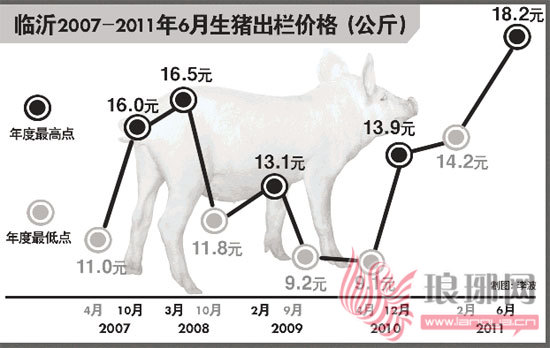 临沂市畜牧部门数据表明,从2007年1月至今,猪肉价格像是坐上了“过山车”大起大落。统计数据表明,2007年以来,生猪出栏价经历了数次价格轮回,其中,两次价格波峰分别出现在2008年3月及2011年6月,价格分别是16.5元/公斤、18.2元/公斤,波谷则分别出现在2010年4月和2009年9月,价格分别为9.1元/公斤、9.2元/公斤。