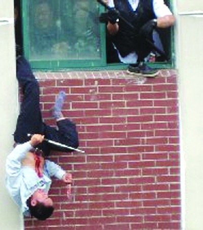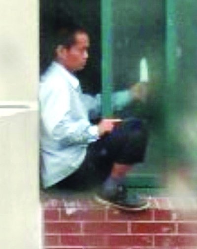 犯罪嫌疑人戴某在现场遗落了一把雨伞,据说警方正是根据雨伞的线索找到了端倪,并最终锁定犯罪嫌疑人正位于离案发地直线距离仅仅500米的栖云苑小区。随后,警方谈判专家以及大批无锡特警全副武装赶赴该小区。戴某迅速窜至5楼楼道,爬上窗台并手持两把尖刀乱舞。双方对峙了有3个小时,楼下不断有人劝说其下来。当地网站的一段视频上记录下了其坠楼的全过程。视频刚开始,只见犯罪嫌疑人拿着两把尖刀坐在五楼的窗台上神情呆滞。随后,画面一转,戴某一只脚被窗台卡住,倒挂在空中,手中的刀依旧在挥舞。戴某还用尖刀划向自己的肚子,顿时鲜血淋漓。11点20分左右,犯罪嫌疑人随着一声“啊”的声音坠下大楼。随后消防员赶到,将犯罪嫌疑人抬出送到无锡第四人民医院后,经抢救无效死亡。