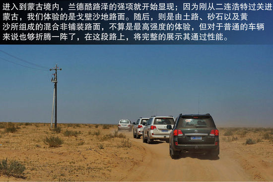 在实际的野外驾驶感受上,进入蒙古境内从二连浩特到赛因山达的路段,全程250公里,其中有大半大约150公里的路程为戈壁越野体验。道路就是由土路、砂石以及黄沙所组成的混合非铺装路面,道路状况不是最差的。但是也有不同程度的起伏和大坑,以及锋利的石块(这段路容易造成爆胎)。