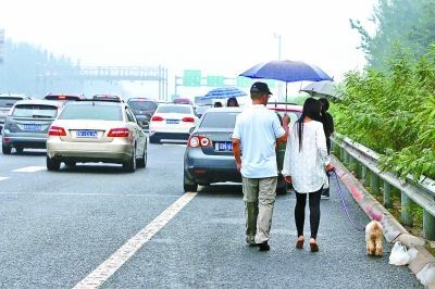 中秋高速路堵车 有人在应急车道遛狗