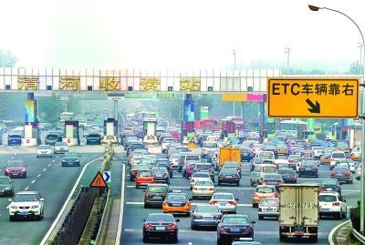 上午8点,交通广播就提示京承高速出京方向车多。为了提高通行速度,出京方向的收费站已经开始进行“复式”收费,一共9个收费口,其中有3个ETC收费口,每个口都有3―4名工作人员站在细雨中发放通行卡。以往收费站附近私家车停靠集结的现象不见了,工作人员用锥形桶码设“禁区”。
