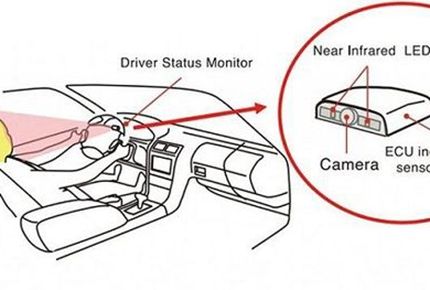 “driver status monitor驾驶者状态监视器”被安装在汽车仪表盘遮光板的下方,由近红外线照相机和ECU(电控单元)构成。近红外线照相机拍摄出驾驶者画像,然后通过ECU对驾驶者脸的方向和眼睛开合状态等等进行实时解析,一旦发现驾驶者持续眼睛处于闭合状态或是脸部未处于正面状态,该系统就会自动发出警报以督促驾驶者安全驾驶。