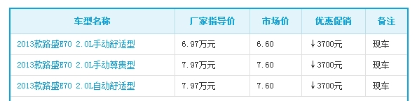 近日,编辑从临沂华泰海雅特贸易有限公司了解到,路盛E70最高优惠3700元,感兴趣的朋友可以到店咨询购买,具体优惠信息请见下表: