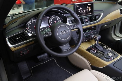 内饰部分A7 Sportback设定偏向于豪华设置,大量的实木应用也说明奥迪对这款车型的把握。A7 Sportback开始引入了新款的四幅多功能方向盘,新方向盘的握感更好, 控制方式也更加合理;全新的仪表盘也是看点之一,此外内藏式的8英寸导航屏幕也非常有实用,此外诸如抬头显示、20向电动座椅调节、ACC自适应巡航等都是新的配置看点。