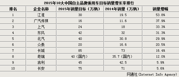 2015年10大自主品牌目标销量公布 江淮领跑增幅榜