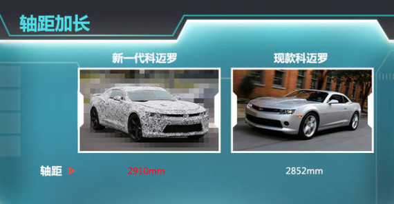 新一代科迈罗外形将借鉴在2014年北京车展亮相的科迈罗概念车的设计风格,并保持车身设计线条的肌肉感,其还将与凯迪拉克ATS、CTS共享全新的Alpha后驱平台。得益于全新平台的设计优势,新车整备质量有望大幅降低。此外相比现款车型,基于Alpha平台打造的新一代科迈罗将会有更长的轴距,第五代科迈罗轴距为2852mm,预计新一代车型轴距长度可增加约60mm,达到2910mm。