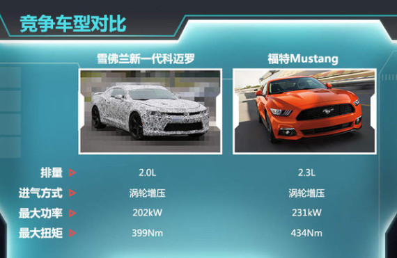 雪佛兰科迈罗与福特Mustang均是美式肌肉跑车的经典车型,两者的竞争关系由来已久。今年1月20日,福特正式在中国市场推出新一代Mustang,入门级车型搭载2.3T引擎,新车在保证动力性能的同时降低了车型排量,满足小排量化发展的市场需求。如今新一代科迈罗也将搭载2.0T小排量引擎,此两者的入门级车型仍将成为竞争对手,并为全球车迷提供不同的驾驶体验。