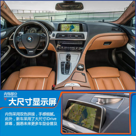内饰方面,新车采用双色内饰搭配,首次可选配对比色缝线(包括象牙白与黑色、黄棕色与黑色两种),选配的内饰条增加了棕色木纹,提升车内整体质感。iDrive显示屏采用了更高档的无边框设计,据了解,未来宝马旗下车型将普及这块屏幕。新BMW 6系还配备有最新一代的平视显示系统,以投影的方式在驾驶员一侧的前风挡玻璃上呈现彩色驾驶信息,包括车辆速度、前方路况、车道建议、速度限制、娱乐信息等诸多车辆信息,从而使驾驶员更加专注于前方的道路,有效提升驾驶安全性。