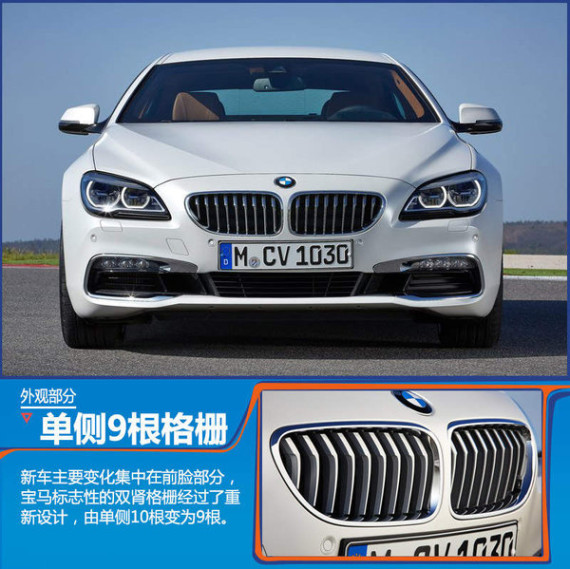 由于全新宝马6系及衍生车是中期改款车型,因此新车保留了这一代车型的主要特征,对诸多细节进行了全新改进。前脸部分,全新宝马6系对大灯组、前保险杠以及双肾造型格栅进行了重新设计,前灯组标配全LED大灯,具备防眩远光辅助系统,内部灯腔的圆形天使眼也进行了微调,增加安全性的同时更具科技感。此外,作为宝马标志性的双肾造型格栅则由10根减少为9根,造型也更加立体。