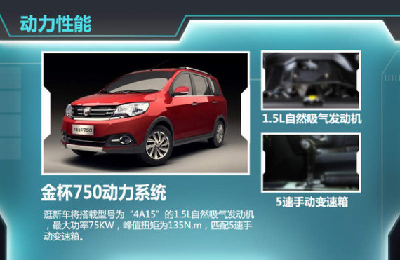 金杯750定位为紧凑MPV,在位于涪陵产区进行生产。新车搭载1.5L发动机,根据空间分布提供3款车型包括1.5L标准型、1.5L舒适型以及1.5L豪华型。车身长宽高分别为4200mm、1695mm和1930mm,轴距达2700mm。