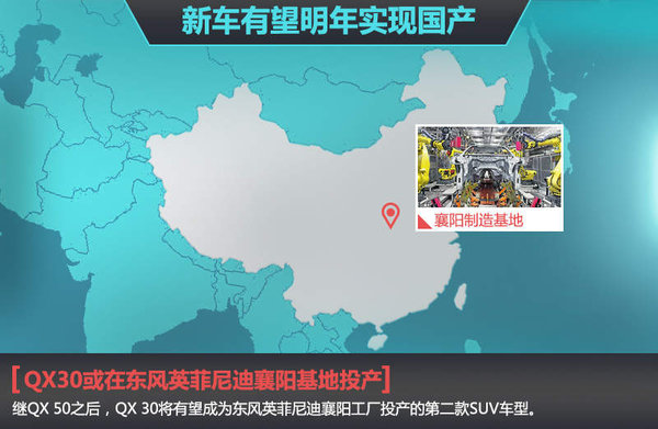 英菲尼迪在推进产品本土化方方面的速度着实令业界惊叹,东风英菲尼迪仅仅成立半年时间,就已经推出了包括QX 50和Q50L两款国产车型,QX 30有望成为第二款国产SUV。“在英菲尼迪的既定计划中,在2018年要实现在中国市场年销量10万辆目标,在这其中,国产车型至少将超过50%。”在此之前,戴雷宣布英菲尼迪中期销量计划时表示,东风英菲尼迪襄阳工厂将有望成为QX 30国产化的制造基地。
