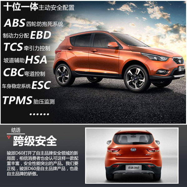 这样的概念至今仍深植于国人心中——安全性和车型的售价、定位有关,而且合资品牌的安全性要远超自主品牌。4月23日,中国汽车技术研究中心公布了2015年度C-NCAP第一批车型评价结果,骏派D60得分59.6分,在取得C-NCAP“五星”安全评价的同时,成为了历年所有SUV中得分第一的车型,成绩在C-NCAP历史上排名第二。这样的结果,打破了国人高售价等于高安全性的理念。