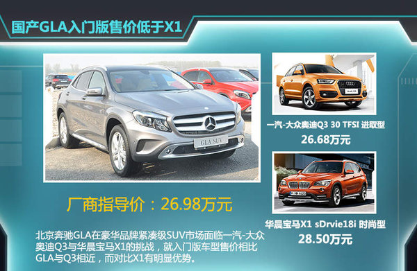 北京奔驰GLA在豪华品牌紧凑型SUV市场将面临一汽-大众奥迪Q3与华晨宝马X1的挑战。其中国产奔驰GLA的入门版车型厂商指导价为26.98万元,与奥迪Q3 30 TFSI 进取型26.68万元的售价相近,低于华晨宝马X1 sDrive18i 时尚型28.50万元的售价。(注:由于北京奔驰GLA不提供手动变速箱版本,因此竞品选择自动挡入门的车型)