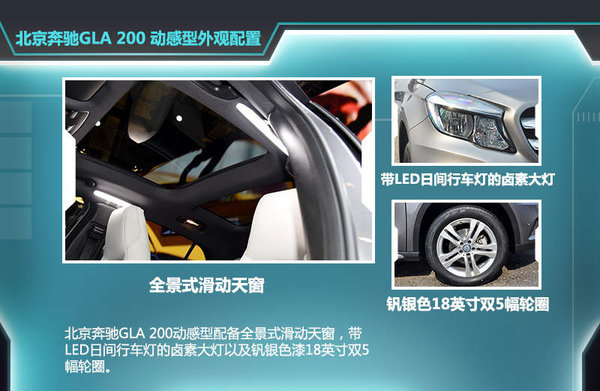 作为北京奔驰GLA的入门版车型,GLA 200 动感型前大灯采用卤素光源并配备LED日间行车灯,而进口GLA 200则配备复式氙气大灯同时还具有大灯清洗功能。国产与进口车型均配备18英寸的轮圈,而国产车型轮圈为钒银色漆配色。此外,国产版并未配备防盗报警功能。全景天窗、电动调节可加热外后视镜、前后雾灯等配置在国产与进口车型上均可见到。