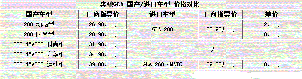 北京奔驰GLA目前推出了五款车型:GLA 200 动感型、GLA 200 时尚型、GLA 220 4MATIC 时尚型、GLA 220 4MATIC 豪华型及GLA 260 4MATIC 运动型。就入门车型而言,北京奔驰GLA 200 动感型售价为26.98万元,较进口版的GLA 200的28.98万元便宜2万元。