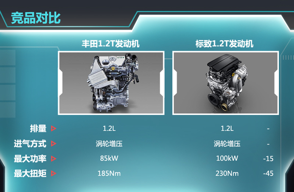 目前各大车企相继在国内汽车市场推出小排量增压发动机,如标致1.2T和福特1.0T等,丰田1.2T发动机与标致1.2T相同排量增压发动机对比并无优势,相信丰田还会对该款发动机进行调校,以获得更高的动力输出。这款1.2T增压发动机是继丰田2.0T发动机后第二款增压引擎,压缩比为10:1,拥有丰田的D-4T缸内直喷和最新的缸内涡流控制技术,使得缸内燃烧速度达到较高的水平,进一步提高了发动机的峰值扭矩以及宽泛、稳定的扭力输出区间。