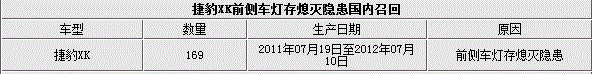 捷豹XK是捷豹旗下一款性能跑车,其操控性、动力出色,外观内饰等又都极具英伦风格,在进入中国市场后也深受国内消费者喜欢。日前,网通社从国家质检总局了解到,由于捷豹XK前侧车灯存熄灭隐患,捷豹路虎汽车贸易(上海)有限公司正式向中国市场提出召回计划,将对部分2012和2013年款进口捷豹XK车型进行召回,据悉将涉及169辆。