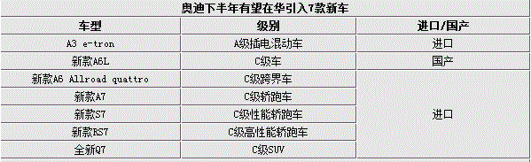 此前奥迪在华发布了包括全新Q7、A3-e-tron和新款A6家族在内的多款新产品,随着2015年进入后半年,该品牌也开始加大新产品的投入力度。近日,网通社一汽-大众奥迪官方获悉:今年下半年奥迪将有包括A3 e-tron、A6L家族(包括中期改款、A6allroad)和新款A7等7款新车型上市。此外,在2015年豪华品牌经销商的艰难出境之下,奥迪也会继续与经销商保持成熟健康的发展关系,特别是持续的支持经销商伙伴。