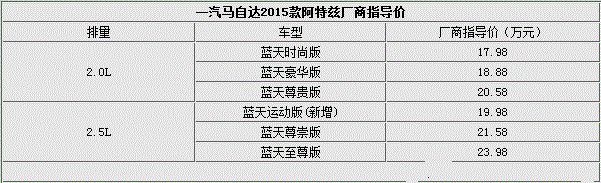 一汽马自达2015款阿特兹售价区间依然为17.98-23.98万元,但是新增加的2.5L入门级车型——蓝天运动版的售价下探到20万元以内,这不仅满足了消费者对于动力性的需求,同时还关照了消费者对性价比的考虑,这将大大提升阿特兹的整体市场竞争力。从2015款阿特兹的售价来看,与竞品上海大众帕萨特和东风日产天籁等车型相比更有优势。2015款阿特兹上市后的市场表现如何,结果令人期待。
