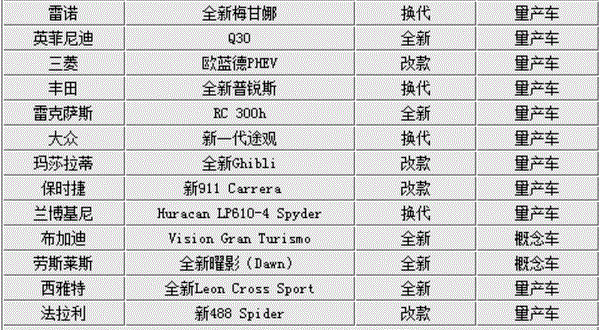 本次车展已经发布的且即将进入中国市场的跑车包括布加迪Vision Gran Turismo、兰博基尼Huracan LP610-4 Spyder、玛莎拉蒂新Ghibli、法拉利488 Spider、保时捷全新911、奔驰SLC等,包括中期改款以及新增车型。