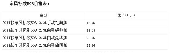 新浪汽车讯:2011年7月10日,东风标致首款进军中高级车型市场的旗舰产品——东风标致508正式上市。本次上市的东风标致508共有2.0L和2.3L两个排量多个级别车型可供选择,车身颜色分为水晶银、碳晶黑、珠光白、钨金灰,价格涵盖16.97万-22.97万元。