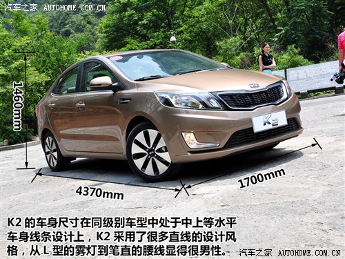 东风悦达起亚K2是国产全新一代小型车,相比之前的锐欧车型K2定位更高,与北京现代瑞纳相似。K2三厢版的长宽高分别为4370mm/1700mm/1460mm,轴距为2570mm。外观尺寸上略超瑞纳。