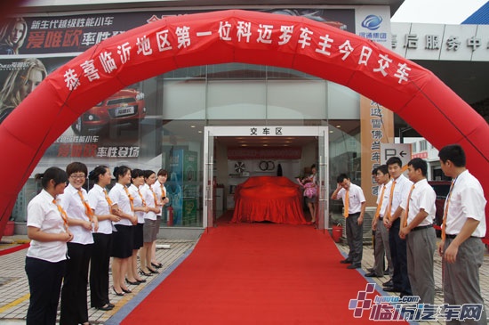 【临沂汽车网讯】7月27日上午11时08分,临沂市第一辆进口雪佛兰科迈罗Camaro -俗称大黄蜂交车仪式在位于罗庄区远通汽车超市的雪佛兰凯华4S店进行。临沂市第一位大黄蜂车主张先生兴奋地接过凯华雪佛兰总经理曹劲武递交的钥匙和鲜花,迫不及待地在爆竹声中和远通人的喝彩鼓掌声中将车开出展厅。
