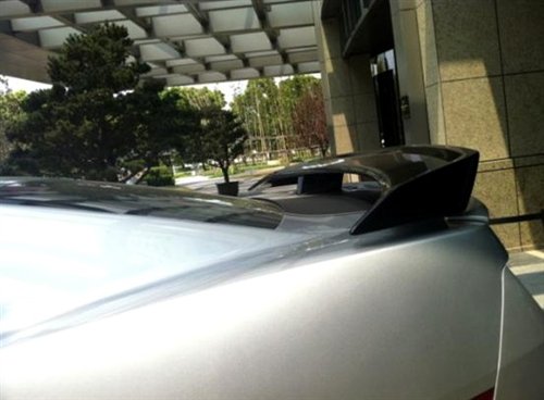 来到车身侧面,除了拉花还加装了黑色运动套件,原来的20寸五幅银色轮毂已经被21寸黑轮毂取代,油箱盖也别具特色。再看尾部,黑色运动尾翼也很抢眼。从车旁的易拉宝上我们也能够发现这些装备都是原厂配备,也就是说这是一辆官方特别版车型,而非个人改装。
