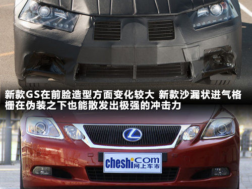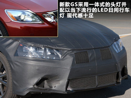 从正面看,全新一代的GS采用和LF-GH相同的大型沙漏状进气格栅,这样的造型即使在厚重的伪装下,依然能散发出极强的冲击力。重新设计的车灯也摒弃了现款双大灯的设计,采用一体式的头灯,并配以当下流行的LED日间行车灯,现代感十足。