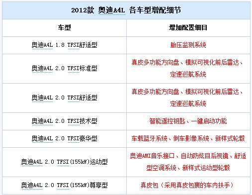 2012款奥迪A4L与老款车型相比,其主要是针对各款车型进行了配置升级(新增的1.8T 手动舒适型除外),而新车在外观和内饰等方面未作任何改动。各款车型具体增配项目请详见下表。