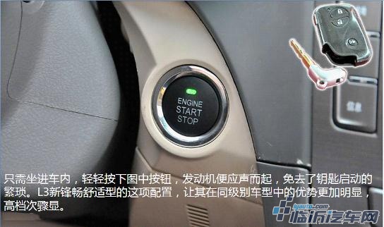 正如萧先生所言,L3新锋畅不仅外表漂亮,内里也挺不错。据销售人员介绍,同价位区间腾翼C30车上配备的行车电脑、电动可调外收后视镜、烟灰缸等L3新锋畅上均有配备;另外,L3新锋畅全部车型上都配备了通常豪车才配备的Keyless系统,只需携带智能钥匙便可实现无钥匙进入、一键启动、电子防盗、寻车、报警等功能,大大提升了L3新锋畅的便利性和安全性。