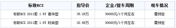 9月2日,标致RCZ在北京正式上市,售价区间为32.88-35.28万元。本站编辑从临沂骏狮东风标致4S店了解到,标致RCZ暂无现车,可以接受预定,订金30000,提车一个月左右。