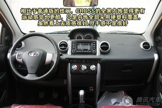 炫丽CROSS的内饰设计的也比较简洁,整体采用了上深下浅的双色搭配,再配合车内多处的圆形设计,给人的感觉非常温馨,而且时尚感也很强,这样的设计相信也会符合大部分家庭的需要。炫丽也采用了中置的仪表盘设计,简洁的旋钮设计使得新手使用变得非常简单,不过在整车实用功能性方面可是一点都没有缩水,比较值得肯定。