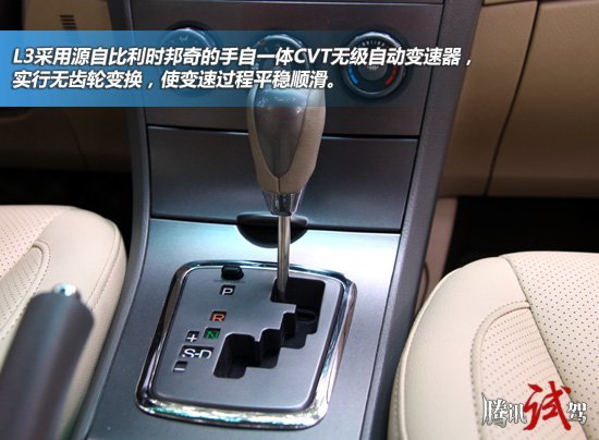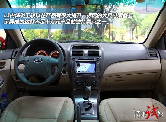 内饰方面,L3的整体风格依旧是比较居家的感觉,中控部分上深下浅的设计也比较正统,不过中控部分引入的一些仿金属拉丝的设计倒是还比较时尚。另外,全系的大液晶屏配置也让整车的感觉更加高档了些,另外高配车型还引入了多功能方向盘,本次上市的两款CVT车型全系标配无钥匙启动、倒车可视系统、倒车雷达、自动感应大灯、电动调节外后视镜等等,给人的感觉是自主品牌在这些细节配置方面有了很大程度的提高。在安全配置方面,L3也配备了ABS(EBD)、前排双气囊、前排侧气囊(高配车型)等安全配置,虽然不如奇瑞A3率先引进了ESP,但是对于这一价位的自主车型来说也已经很厚道了。