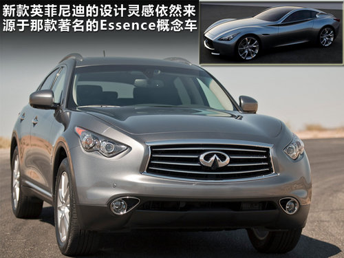 2012款英菲尼迪FX的设计灵感依然来源于那台充满奇幻色彩的Essence概念车。新款FX在整体上秉承了英菲尼迪的传统,精准的诠释出品牌口号“新灵感 心动力”的精髓。与现款相比,新款FX仅对细节方面进行了改进与升级,动力方面并无改进,另外新增加的石墨黑取代了原来的铂金灰车漆。