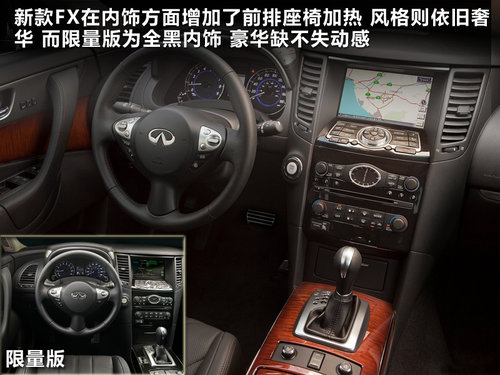 新款FX的内饰变化并不大,仅仅添加了前排座椅和改变了仪表盘背光颜色。除此之外整个内饰的设计风格极具质感。全方位的真皮包裹配以局部的实木点缀为FX的内饰定下了奢华的格调,而真皮三幅多功能方向盘的加入则为FX平添了几分运动。大尺寸的液晶屏与众高科技配置凸显身份。另外限量版FX35的内饰为全黑风格,豪华之余不失运动。