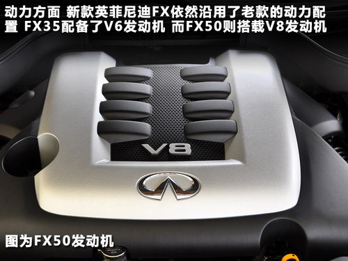 动力方面,新款款的英菲尼迪FX35和FX50将继续沿用现款车型的装备,FX35车型将沿用一款最大功率303马力的3.5升V6发动机,而FX50车型依旧搭载最大功率390马力的5.0升V8发动机。与这两款发动机配备则是我们熟悉的那款7速手自一体变速器。