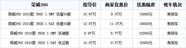 市场行情:笔者从上海荣威4S店获悉,店内有部分2010款荣威350现车,其中1.5LMT讯驰版最高优惠2.2万元,其他车型优惠幅度保持在1.5万-1.8万元元左右。