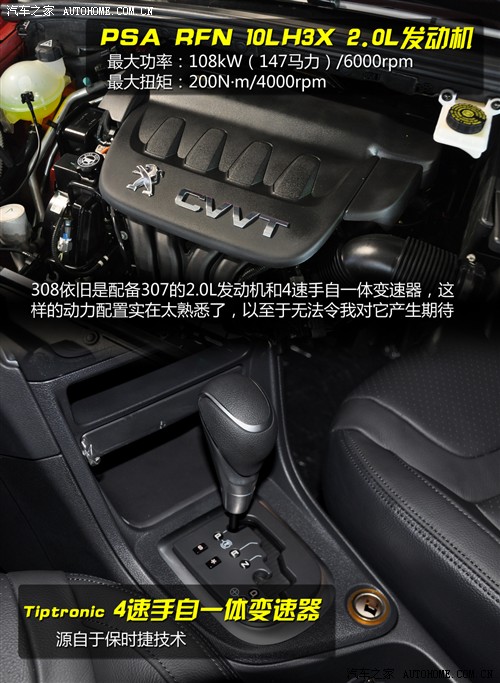 动力方面,308搭载的1.6L发动机最大功率输出106马力,最大扭矩为142N·m;2.0L发动机的最大功率为147马力,最大扭矩为200N·m。传动系统出现的是5速手动和4速手自一体变速器,这两套动力系统我们已经很熟悉了。