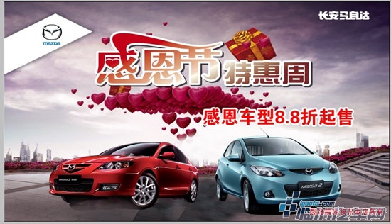 一直以来,炫动款马自达2、经典款马自达3一直都备受广大朋友的关注,此次活动亦为达成各位爱车之士的要求,特推出部分车型,作为这个感恩节的温情献礼。更希望通过这次价格优惠活动能够让更多的朋友在拥有爱车后能够感受到我车型近年来作为时尚座驾所带来的全新生活体验!活动日期:2011年11月23日至27日 ,欲购从速!